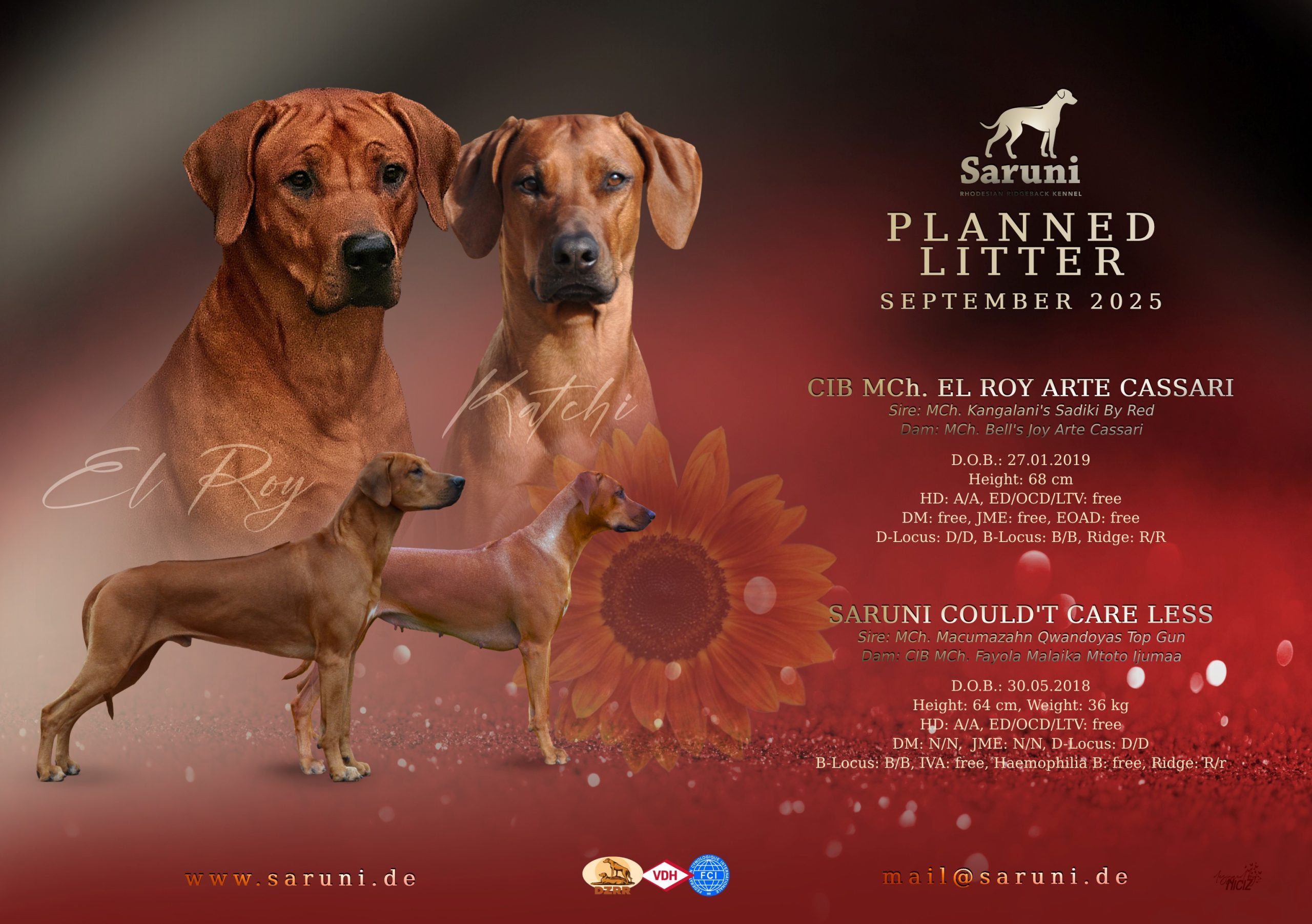 Die gesundheitlichen Auswertungen beider Eltern könnten nicht besser sein! Katchi und ElRoy sind frei von allen vererbbaren Krankheiten sowie auch die röntgenologischen Auswertungen könnten nicht besser sein! Wie mich meine bisherigen Welpenelter kennen, habe ich natürlich auch viel Wert auf den Charakter gelegt – auch hier erwarte ich ausgeglichene Welpen mit gutem Temperament.